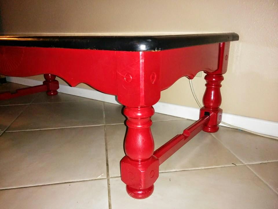 I decided it needed a little more pizzazz, so I to painted the bottom half red, since our main colors are red and black. I used painters tape around the top edge to cover the black top and spray painted the bottom with red spray paint. Again, I did several coats. I waited a few days, to make sure the paint as completely dry before putting it back in the living room.